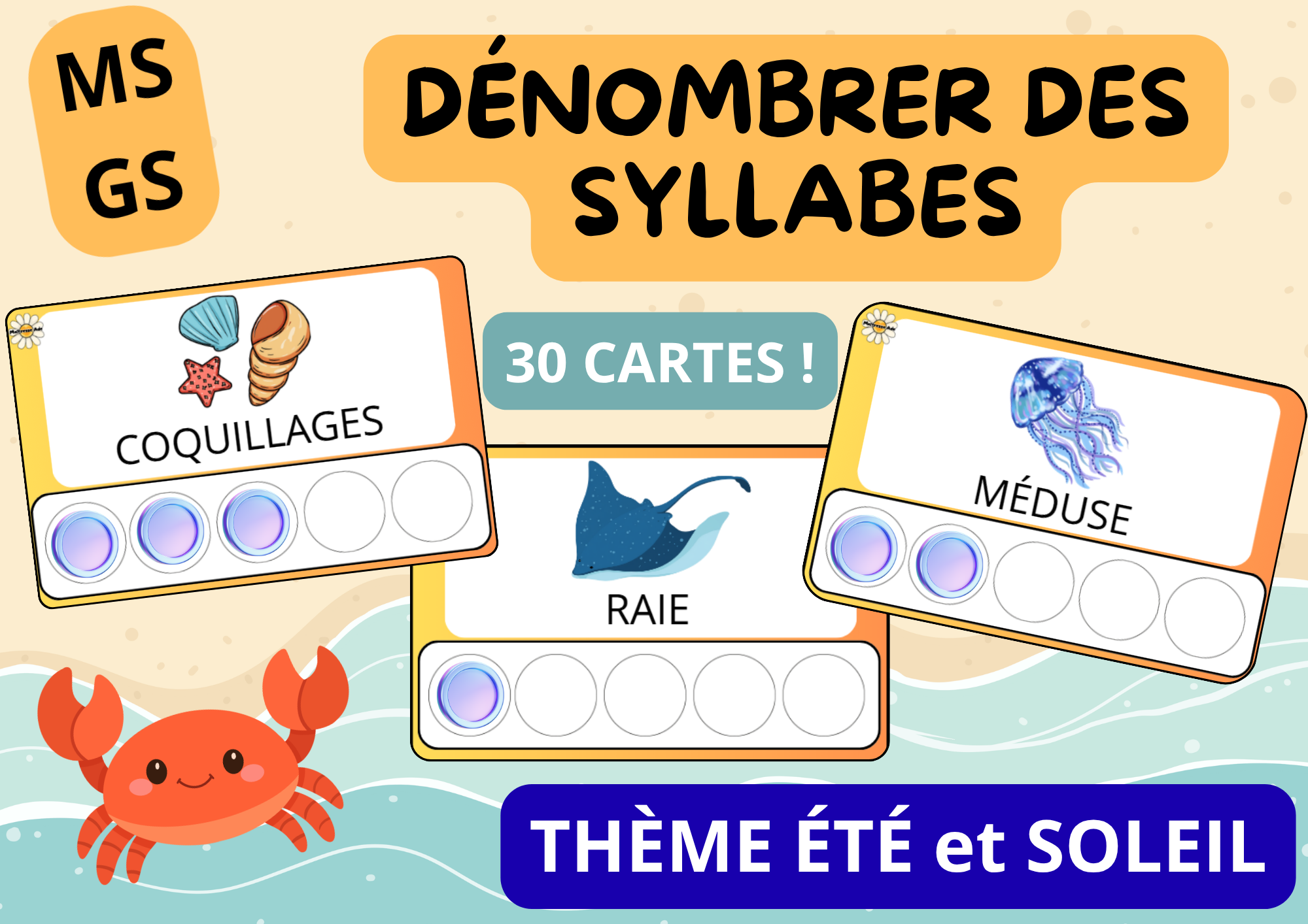 Été ☀️, GS, MS, 🌈 Tri par thème 🌈, 🌟 NOUVEAUTÉS 🌟, 🐣 Maternelle 🐣⛱️ PHONOLOGIE – Dénombrer les syllabes – 30 cartes – MS/GS ☀️