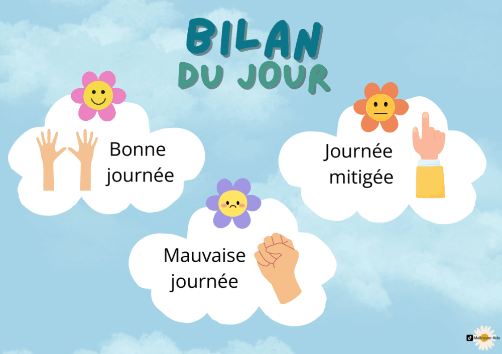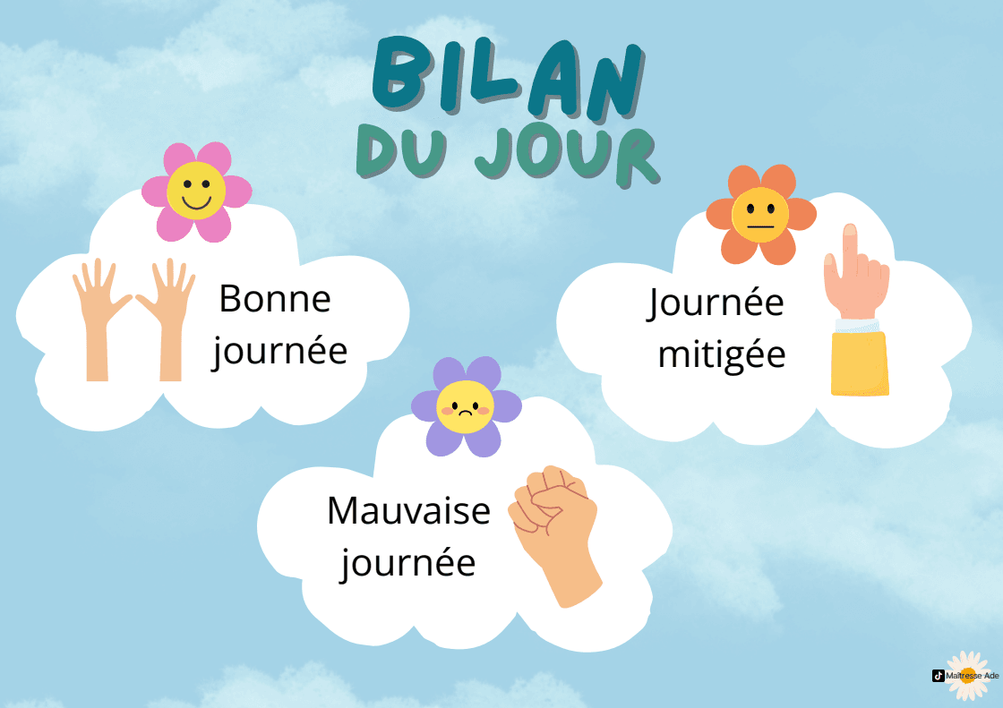Un affichage simple et visuel pour réaliser rapidement le bilan de la journée en classe avec les élèves.