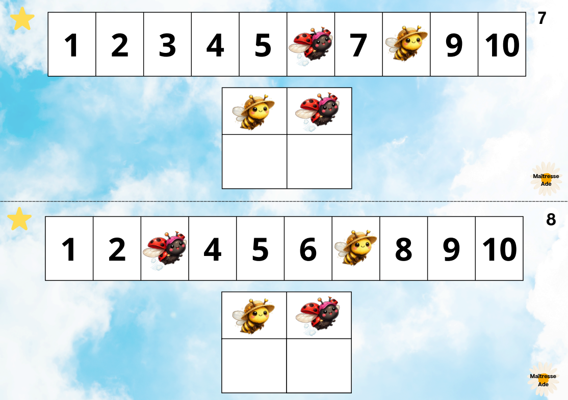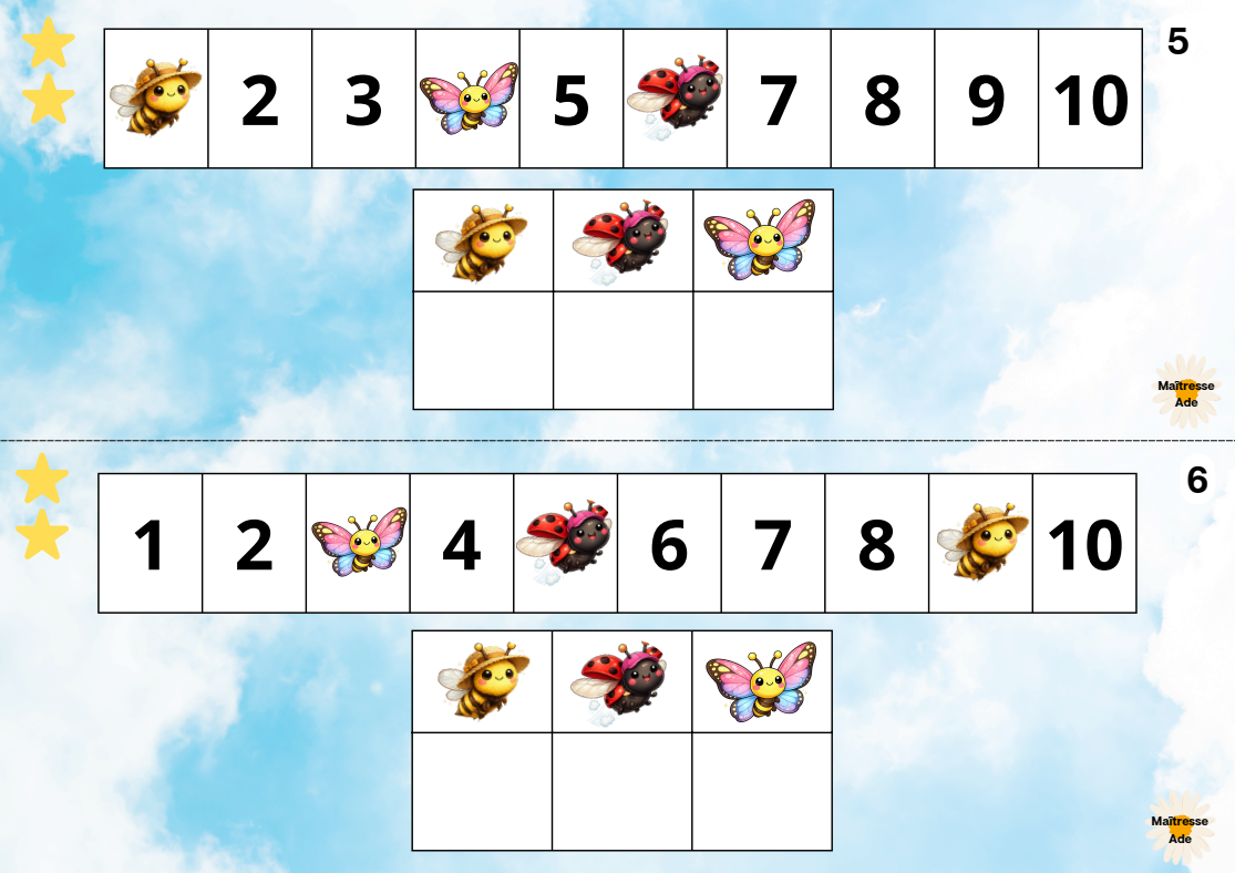 Dans cet atelier de manipulation, les élèves de moyenne section et grande section s’entraînent à compléter la suite numérique de 1 à 10 dans un univers printanier rempli de petits insectes .