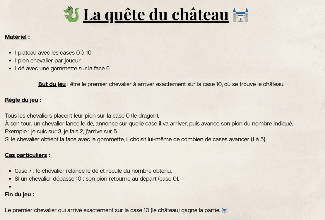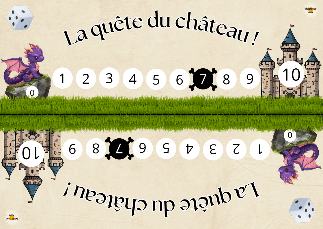 Les joueurs commencent sur la case 0 (le dragon) et doivent atteindre exactement la case 10 (le château) pour gagner la partie.