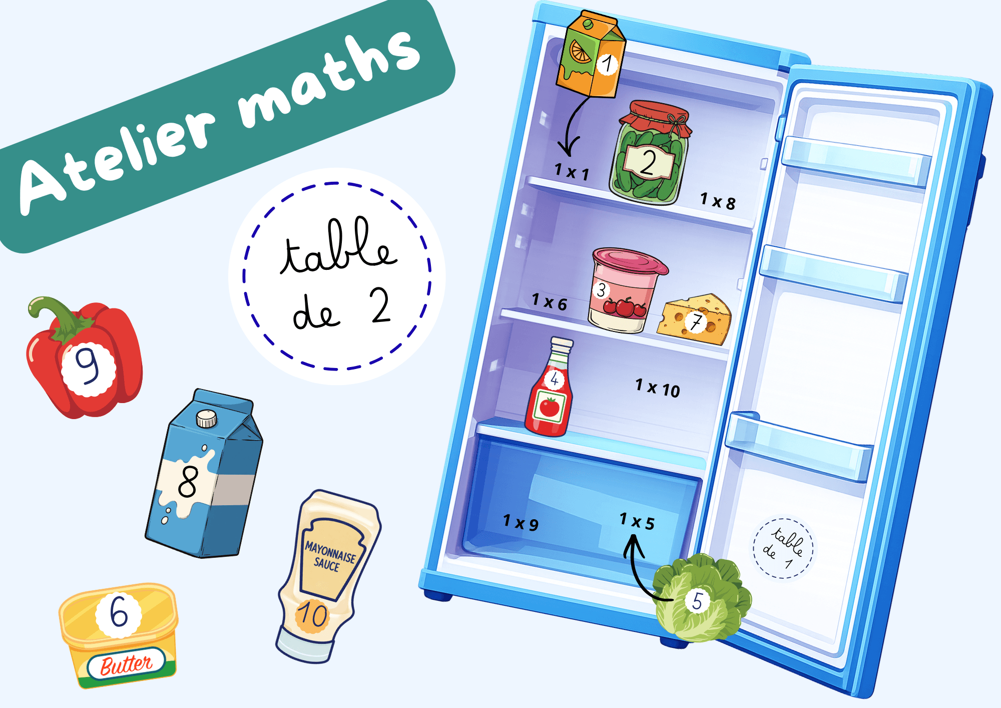 Avec ce pack d’ateliers de manipulation, les élèves révisent les tables de 1 à 5 à travers un univers de cuisine motivant : frigo à remplir, aliments à trier, cookies à associer… le tout en autonomie
